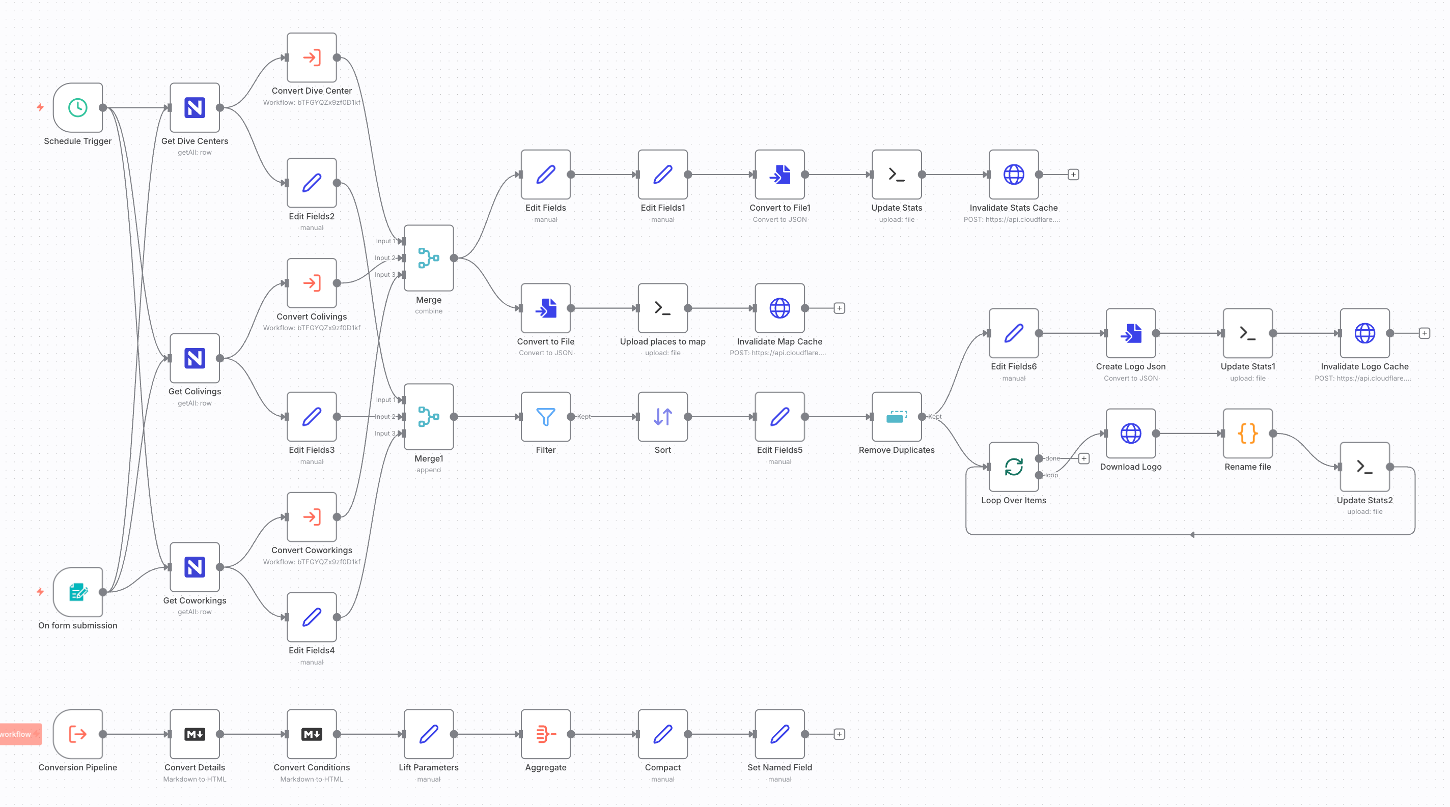 All partner entries live primarily in NocoDB. From there, n8n compiles a public read model every hour: